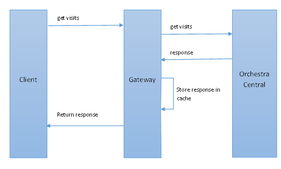 1. Client (e.g. a mobile app) asks for Visits in a Queue (it is configured to access central through the gateway).