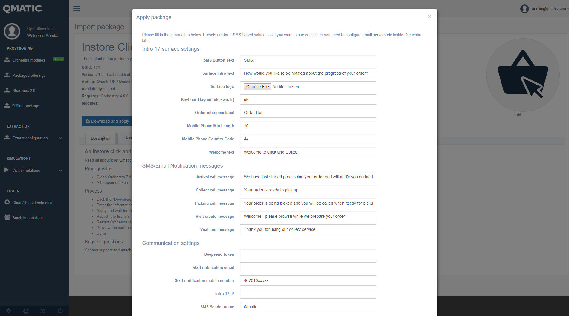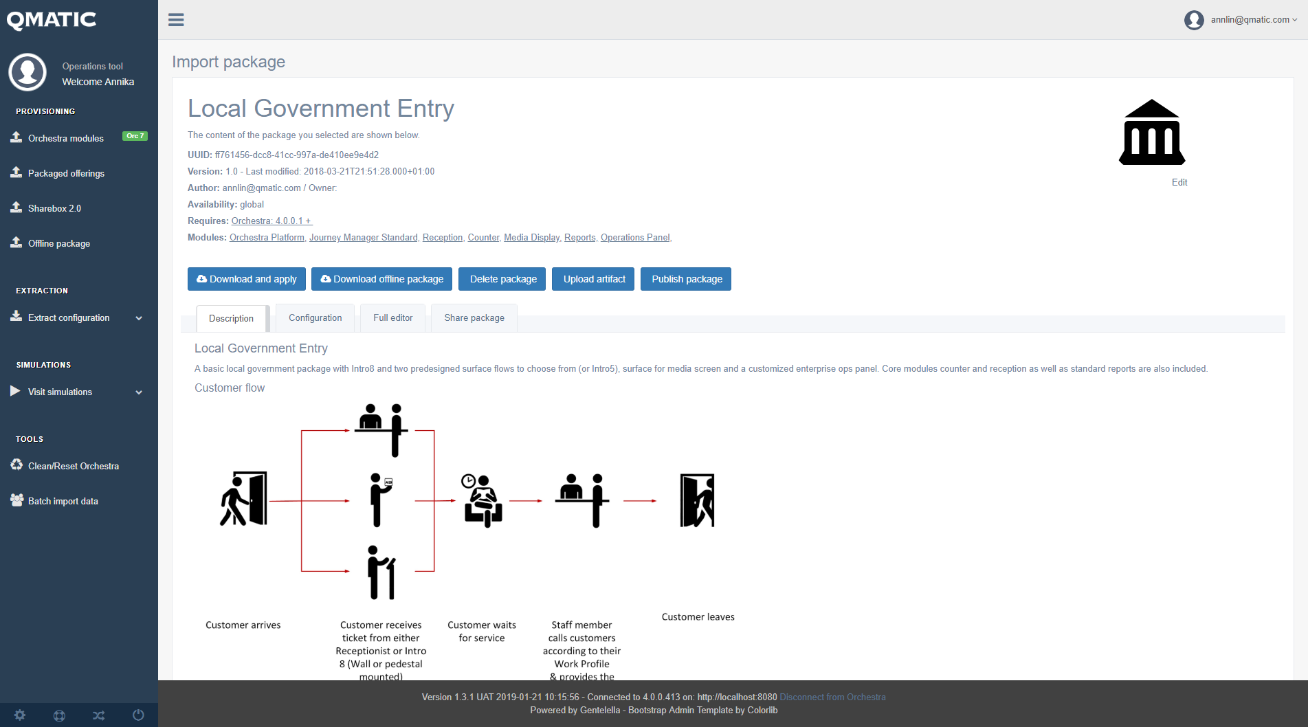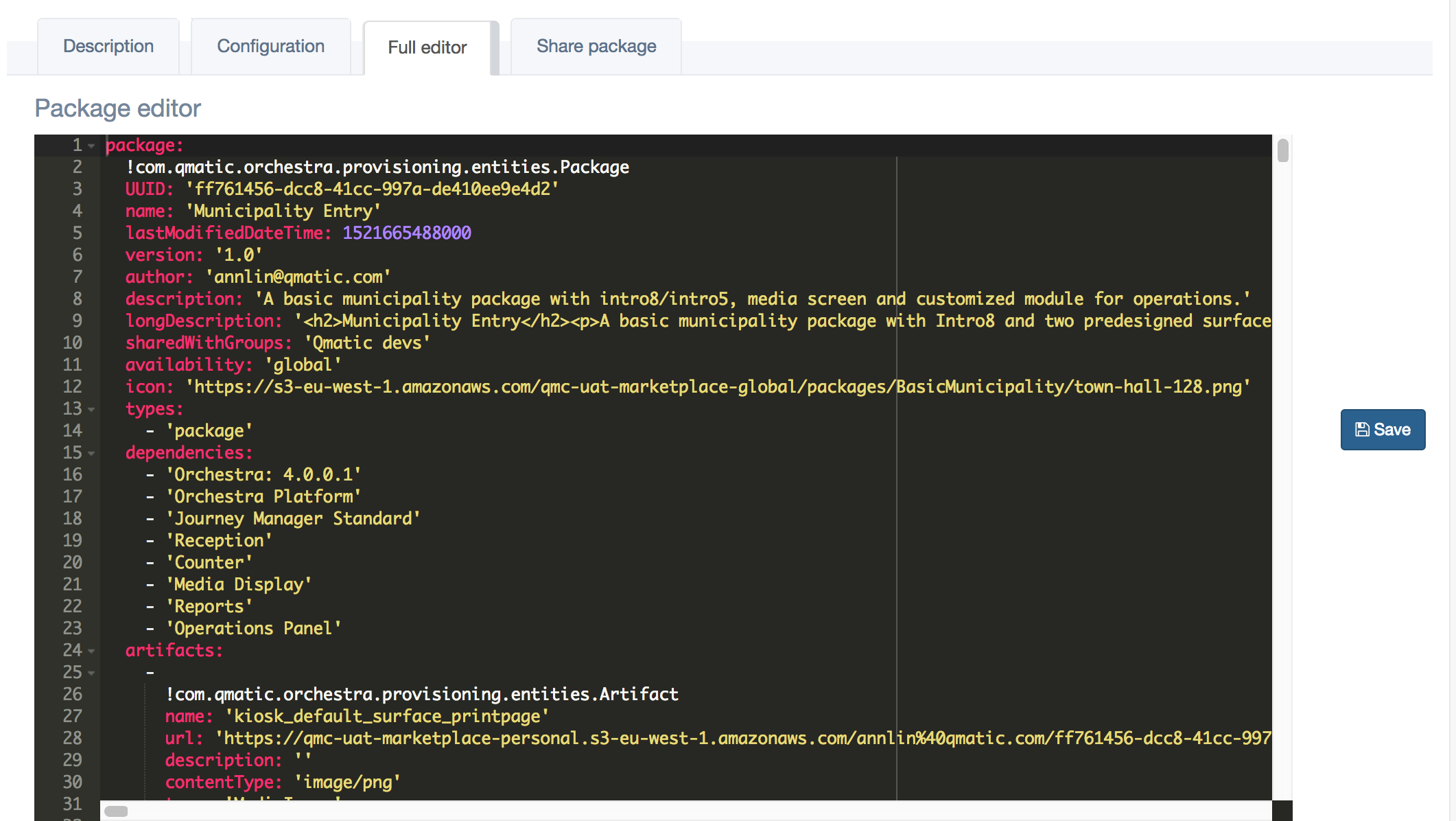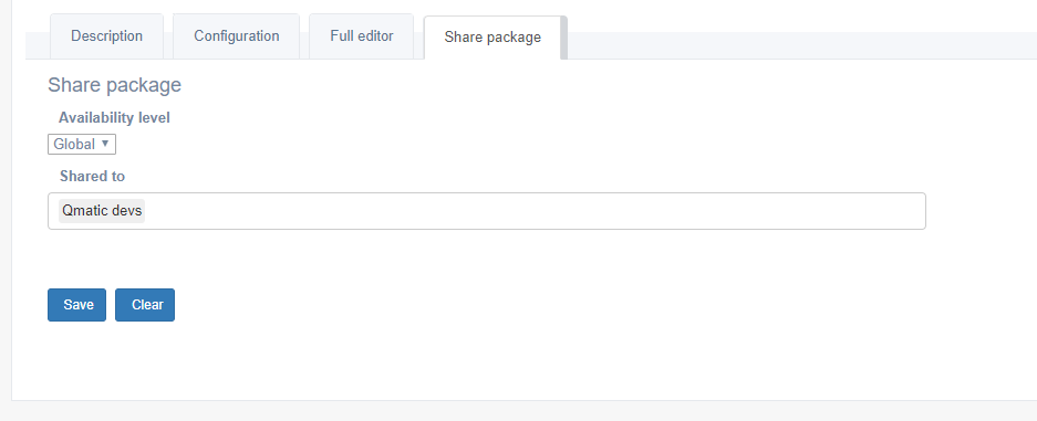 It is possible to share a package with everyone – logged in user’s own organization as well as specific Qmatic organizations. By default a created package is only visible to the creator, i.e. private (and for super user).