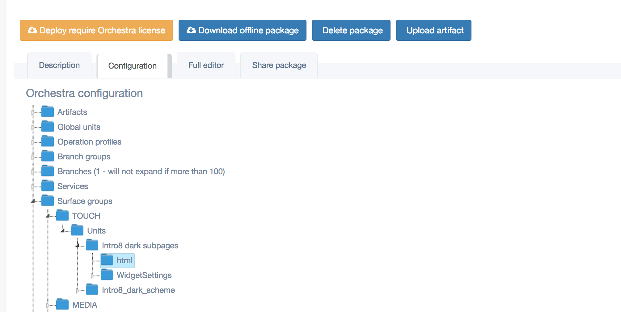 In addition to the Full editor, there is a possibility to work with surface html a bit more structured. Under the Configuration tab you can navigate down to the surface you want to edit and click the html label.